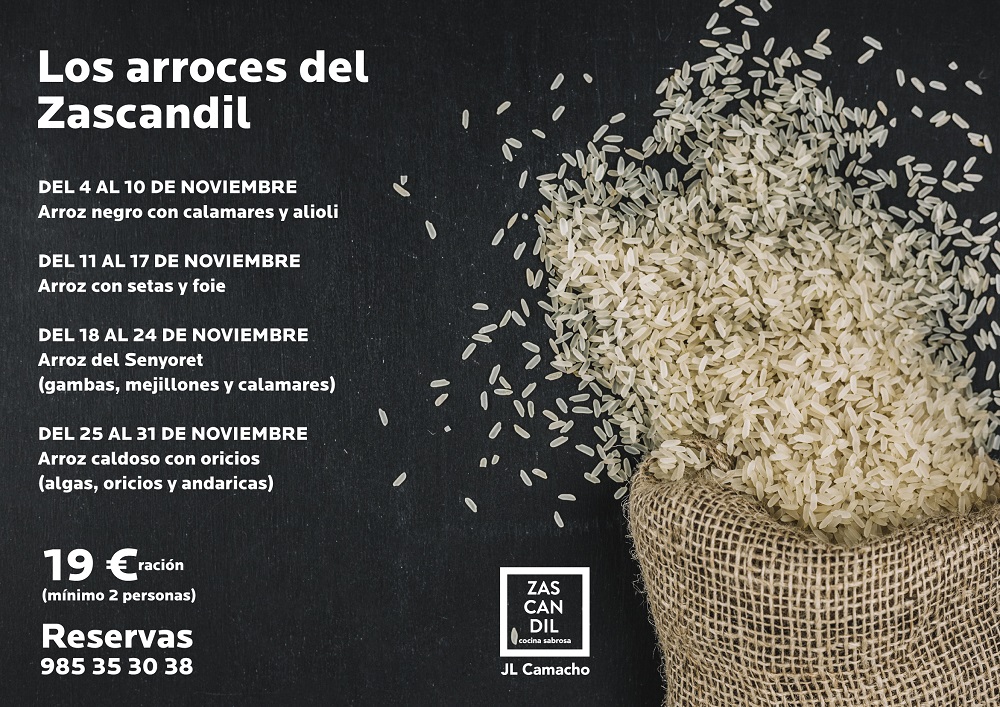 Noviembre es el mes del arroz en Zascandil. Hemos diseñado unos arroces sabrosos que podréis disfrutar cada semana. La primera semana del 4 al 10 de noviembre será el turno del Arroz negro con calamares y alioli. Del 11 al 17 de noviembre llega el momento del Arroz con setas y foie. La tercera semana del mes, del 18 al 24 de noviembre, el protagonista será el Arroz del Senyoret con gambas, mejillones y calamares. Para finalizar, del 25 al 31 de noviembre, se podrá disfrutar de Arroz caldoso con orios.