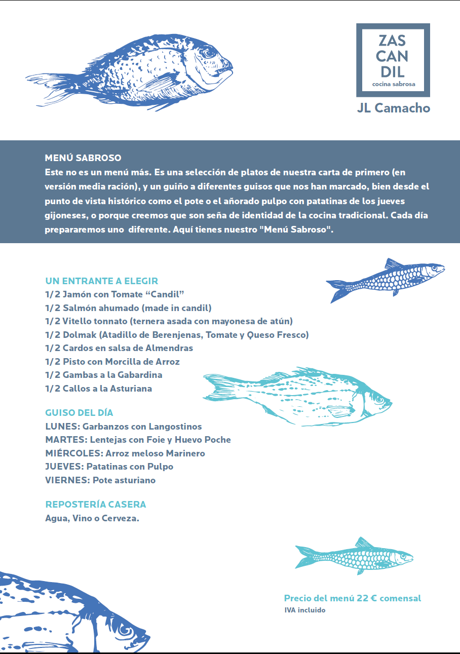 Este no es un menú más. Es una selección de platos de nuestra carta de primero (en versión media ración), y un guiño a diferentes guisos que nos han marcado, bien desde el punto de vista histórico como el pote o el añorado pulpo con patatinas de los jueves gijoneses, o porque creemos que son seña de identidad de la cocina tradicional. Cada día prepararemos uno diferente. Aquí tienes nuestro "Menú Sabroso" para los días laborables.